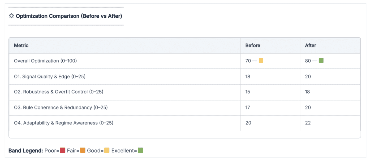 Optimization Evaluation (Before vs After with O1–O4 Sub-Scores)